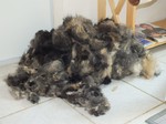 Rocky ist sehr brav - vorsichtshalber mit Beisskorb. Endlich nach 11/2 Std ist das gröbste Fell weg. Kurze Pause im Garten. Weiter mit Baden. Das gefällt unserem Buben. Danach Feinschnitt Zehen, Fussballen, Ohren, Schweif alles wird verschönert. Zum Schluss ein Haufen Fell - ein nackter Hund.